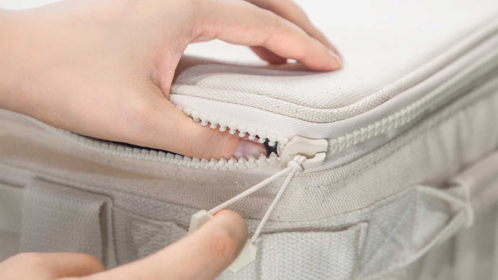 右画像のように、ジッパーを引く手と反対の手の親指を、フタと本体の間に入れながらジッパーを引くことで、スムーズな開閉が可能になります。ぜひお試しください。