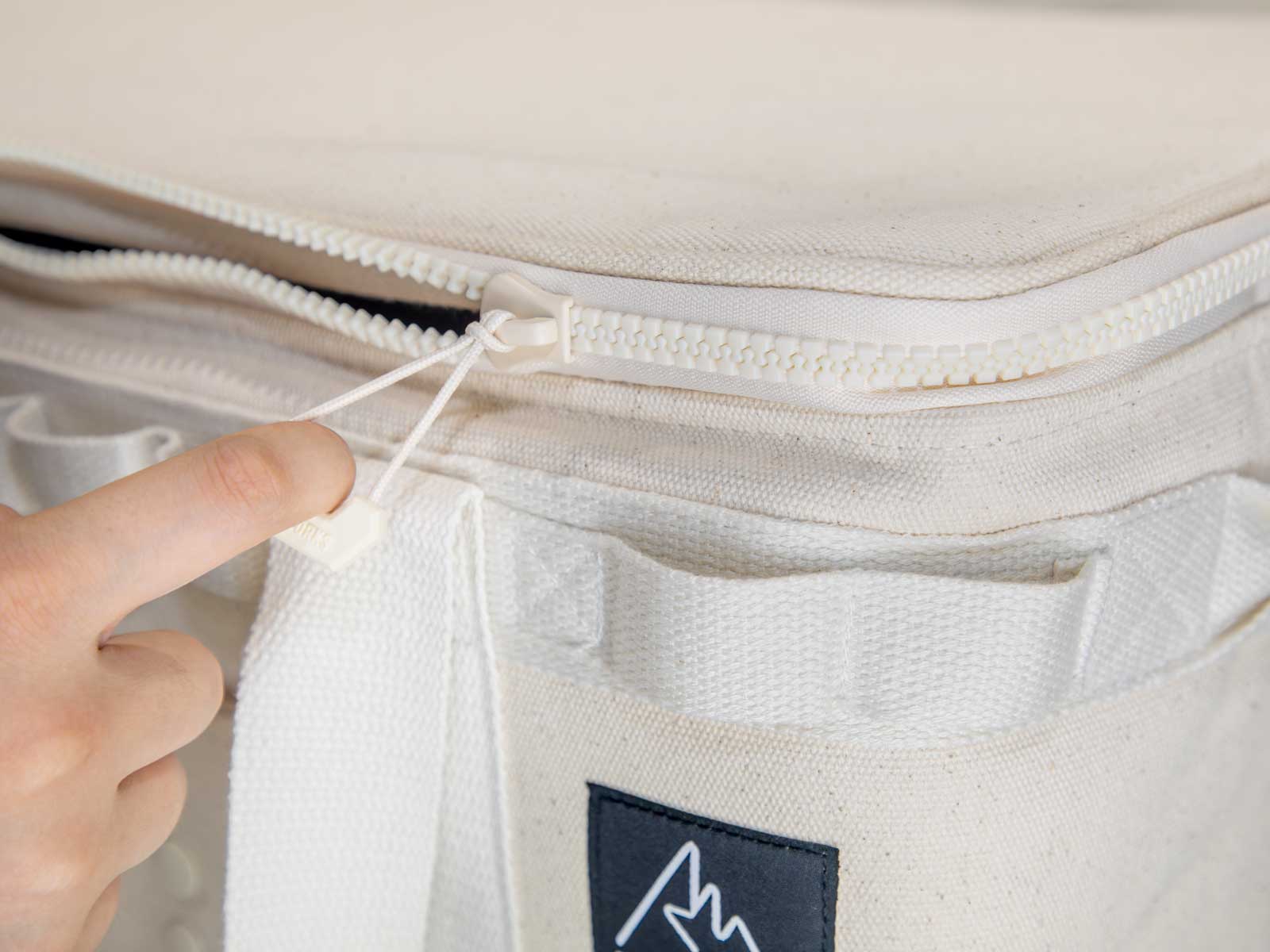 「AURORA SOFT COOLER L」では、可能な限り保冷性能を高めるため、上下のフタに止水ジッパーを採用しています。また、強度を確保するために大型のジッパーを使用しており、この構造により特に角の部分では縫製の関係上、ジッパーレールがやや倒れ気味になることがあります。そのため、ジッパーの動きがスムーズでない場合がございますが、製品の特性としてご理解ください。