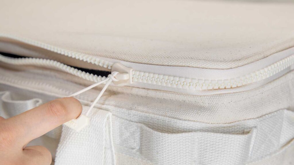 上下蓋部には強度を保つ大型の止水ジッパーを採用しています。