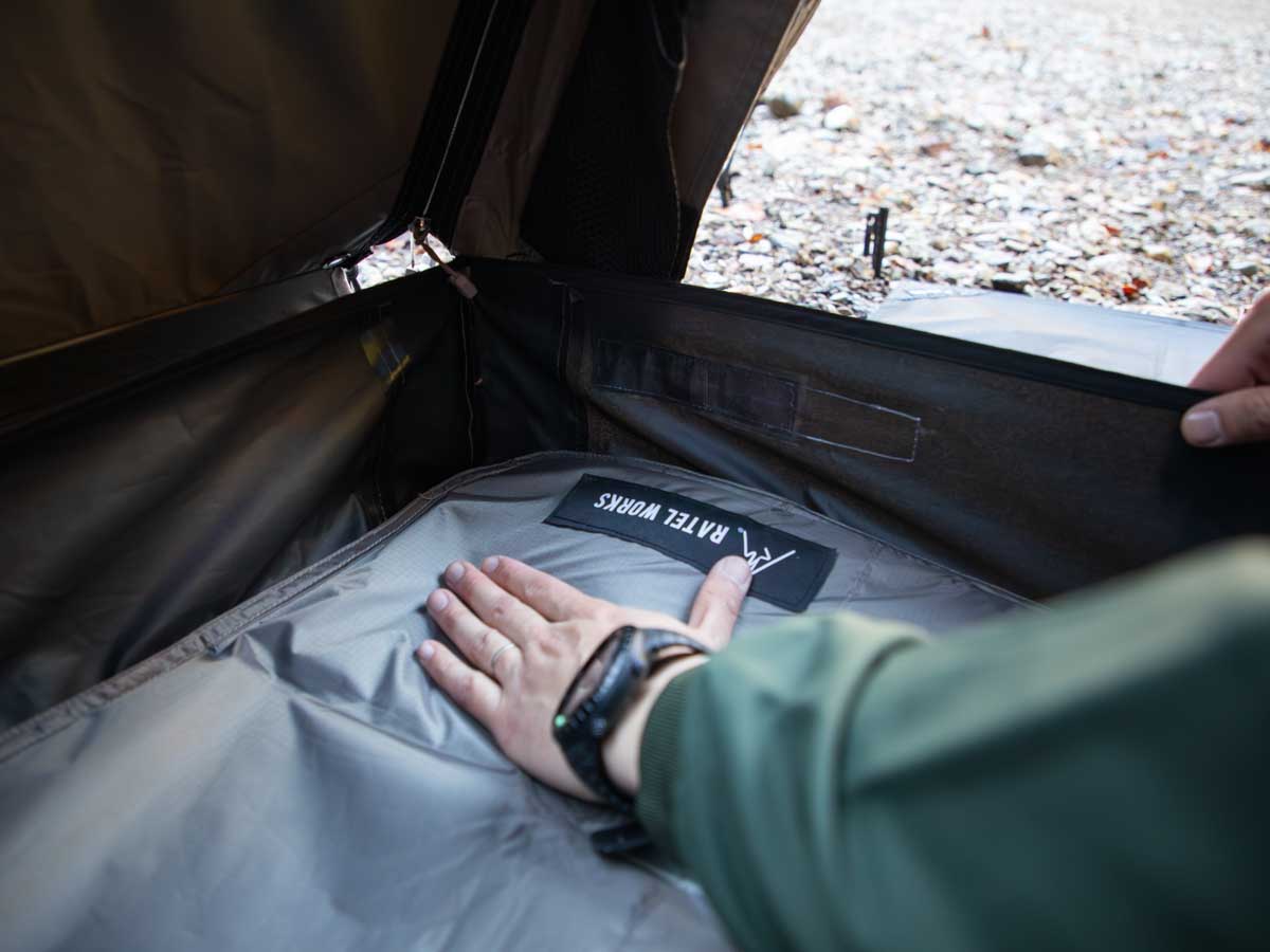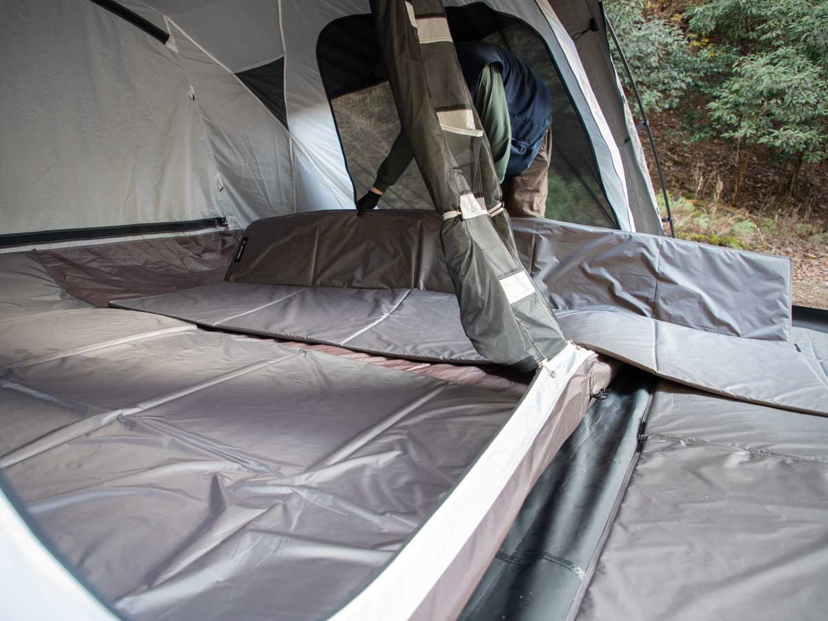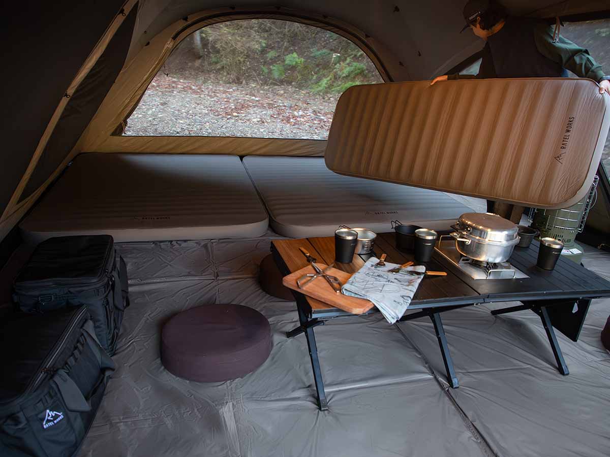 インナーテント装着なしで空間を広々と使うことができ、RATELWORKS製のインフレータブルマットが「Sサイズ×1 + Wサイズ×2」設置できます。