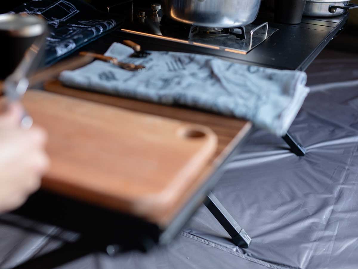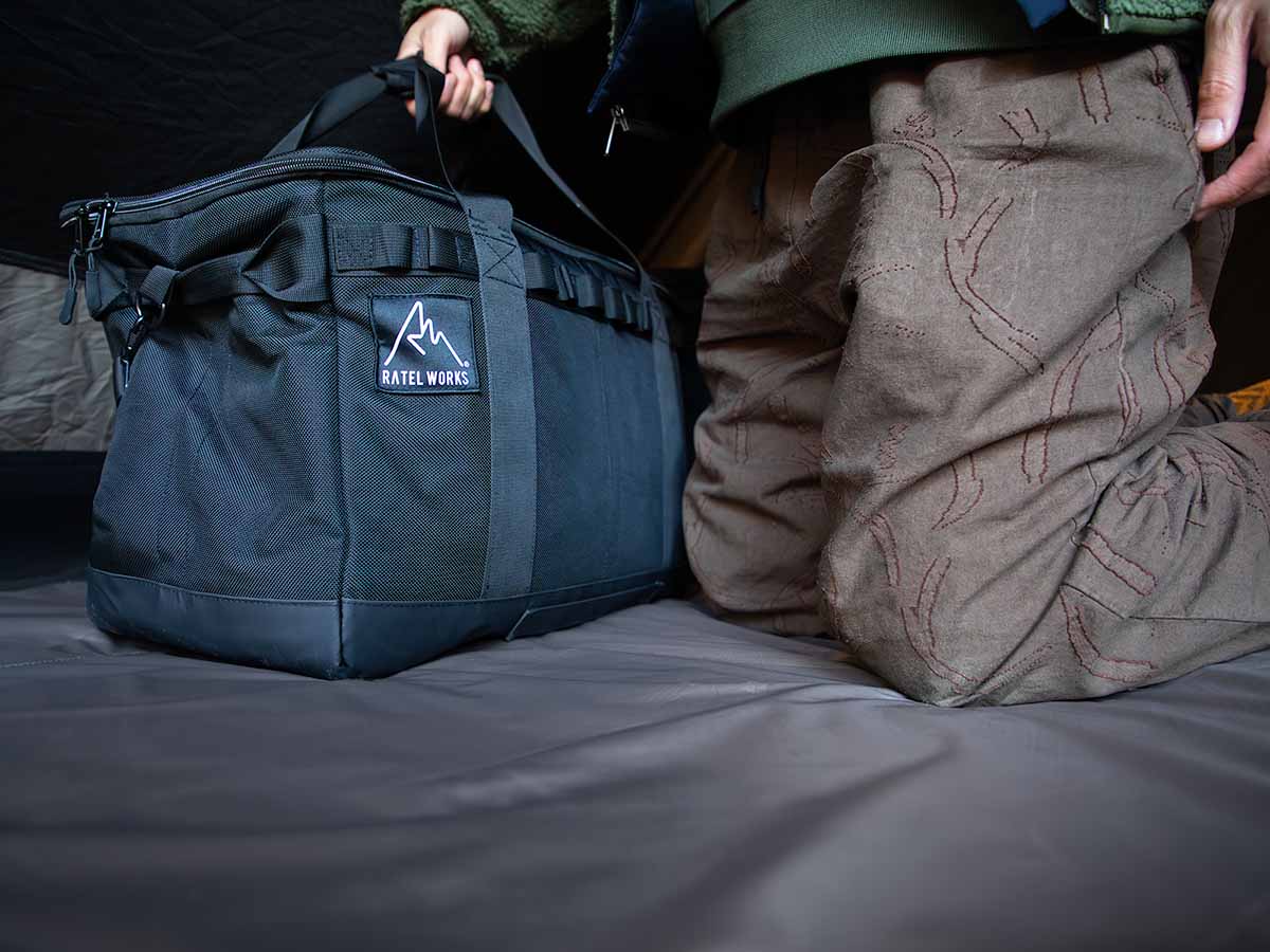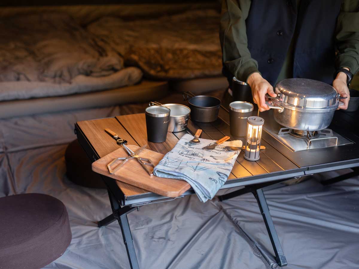 冬キャンプで荷物が増えがちなシーンでも、フロア一面をお座敷スタイルにすることでチェアやフィールドラック、インナーテントを使わずに快適な空間を確保できます。ギアバッグやクーラーバッグを床に直接置いて使えることで荷物に余裕が生まれ、シンプルにまとめることができます。