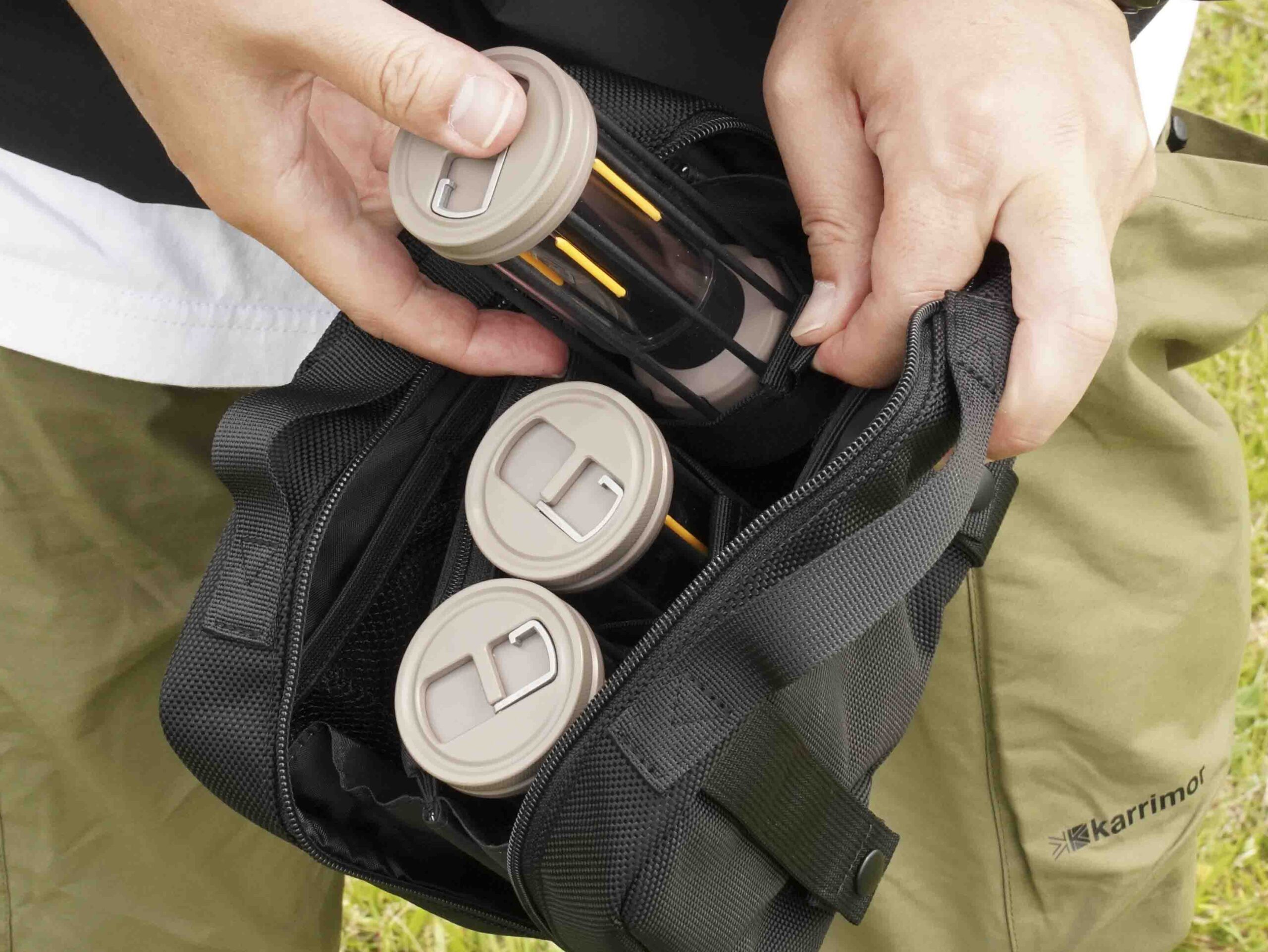 ポーチ背面のベルトは、ベルクロテープ仕様となっており、テーブルやチェアなどあらゆる場所に固定することができます