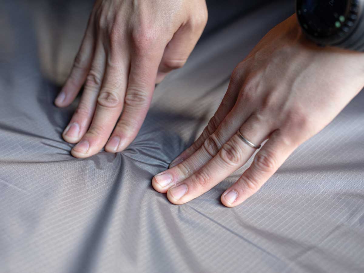 踏み込みや擦れにも強い68Dリップストップポリエステル生地を採用し、軽量性を保ちながら十分な耐久性を両立しています。表面には撥水加工、裏面にはPUコーティングを施し、耐水圧1,500mmを確保。水分や汚れが付着しても拭き取りやすく、地面からの結露や湿気が表面に伝わりにくい仕様です。