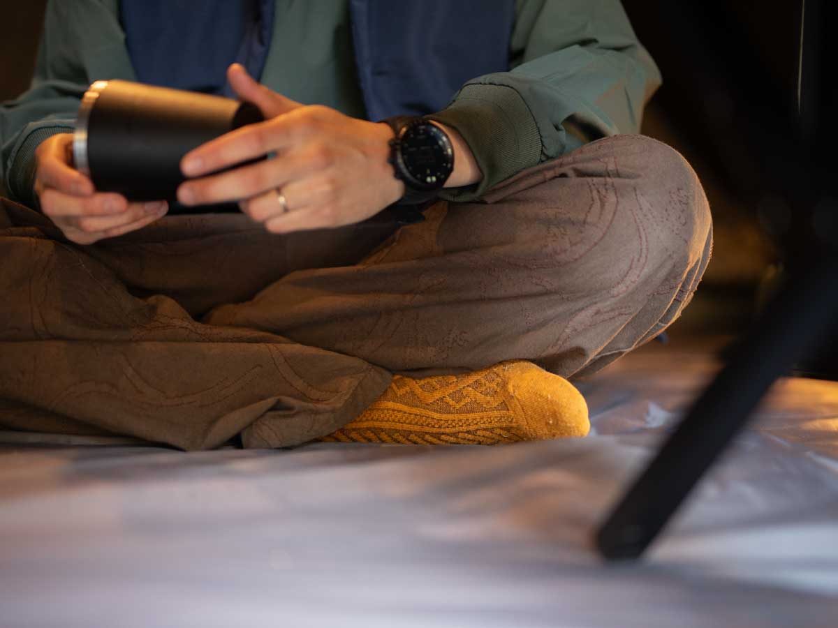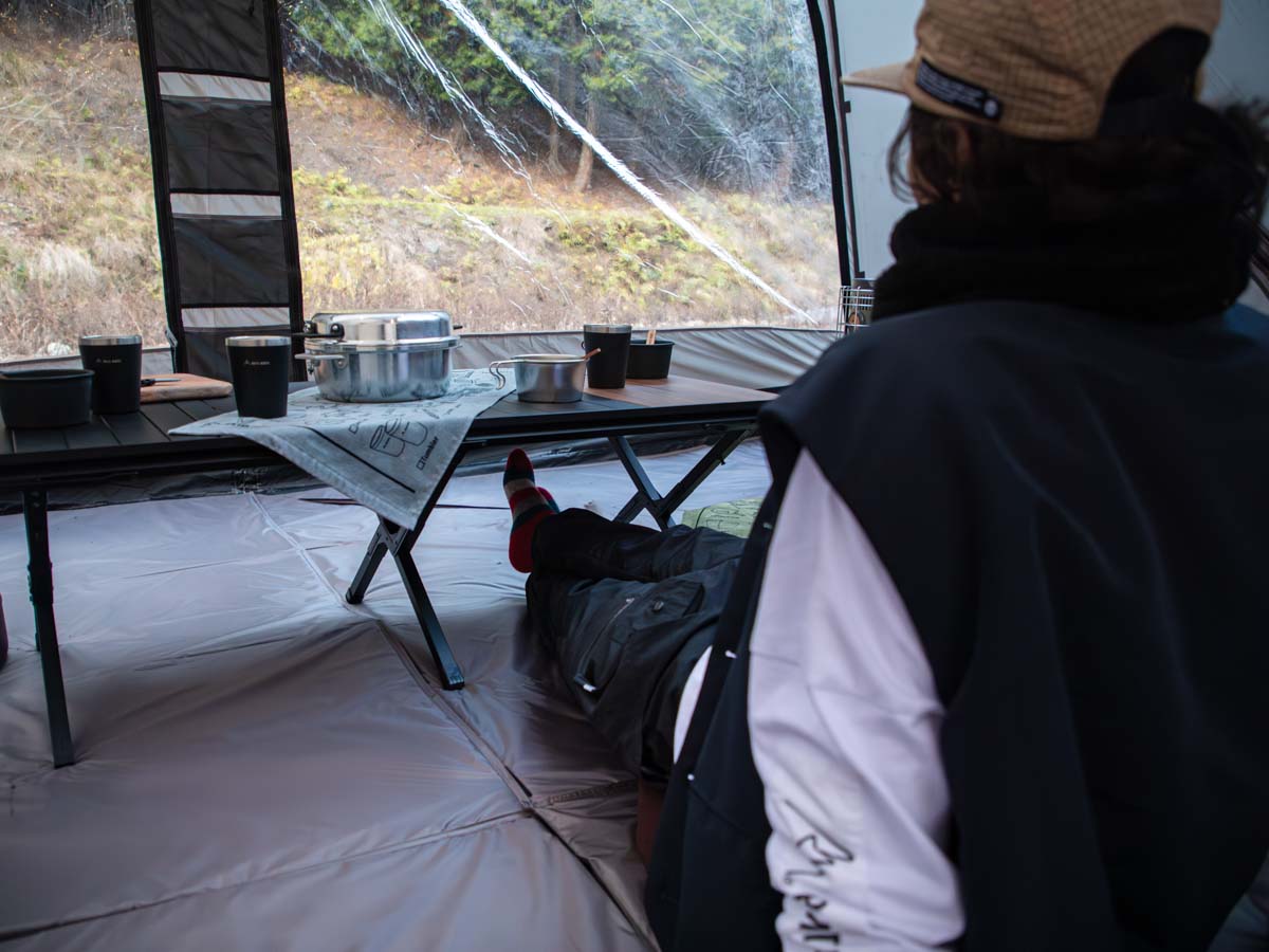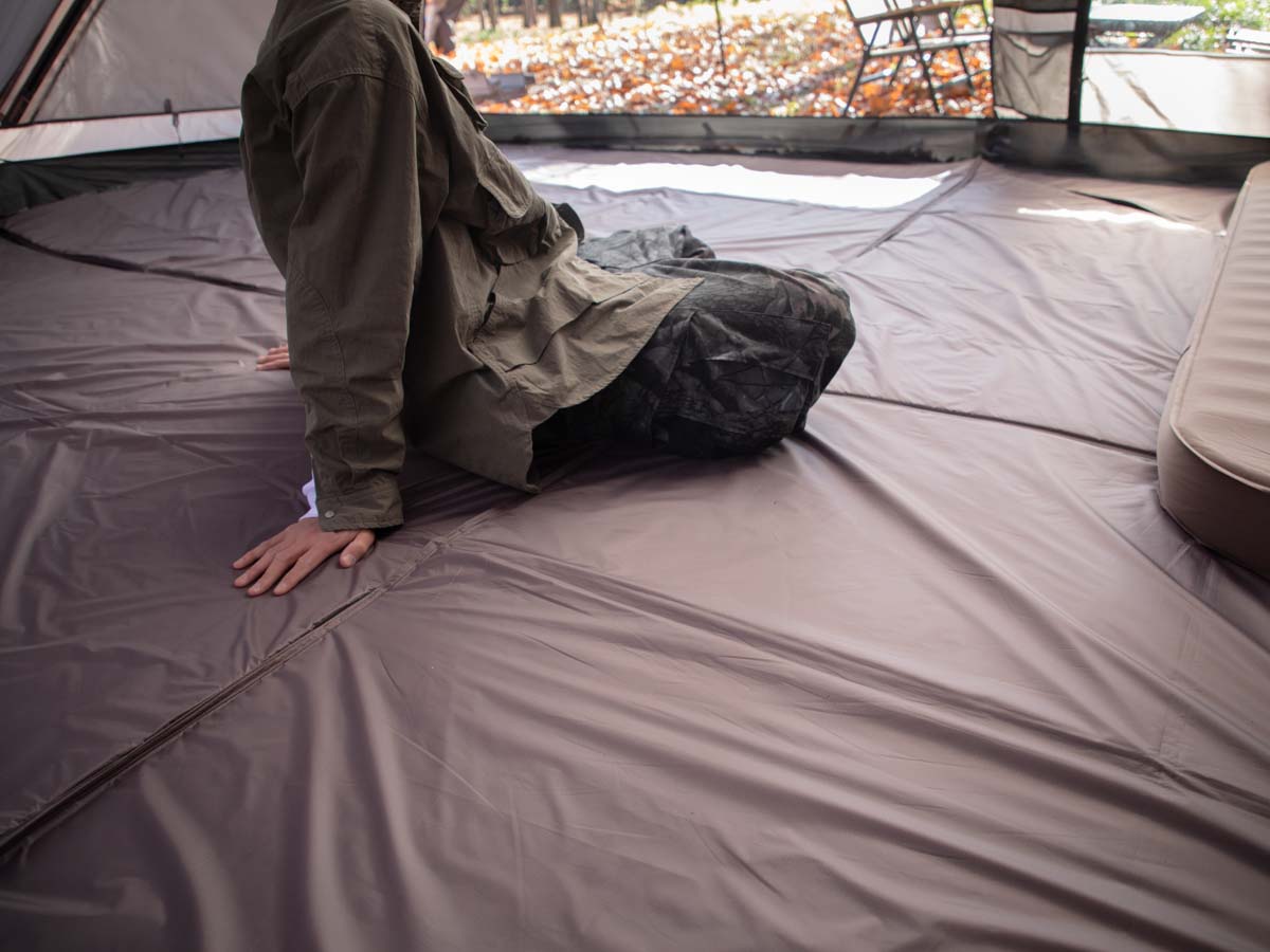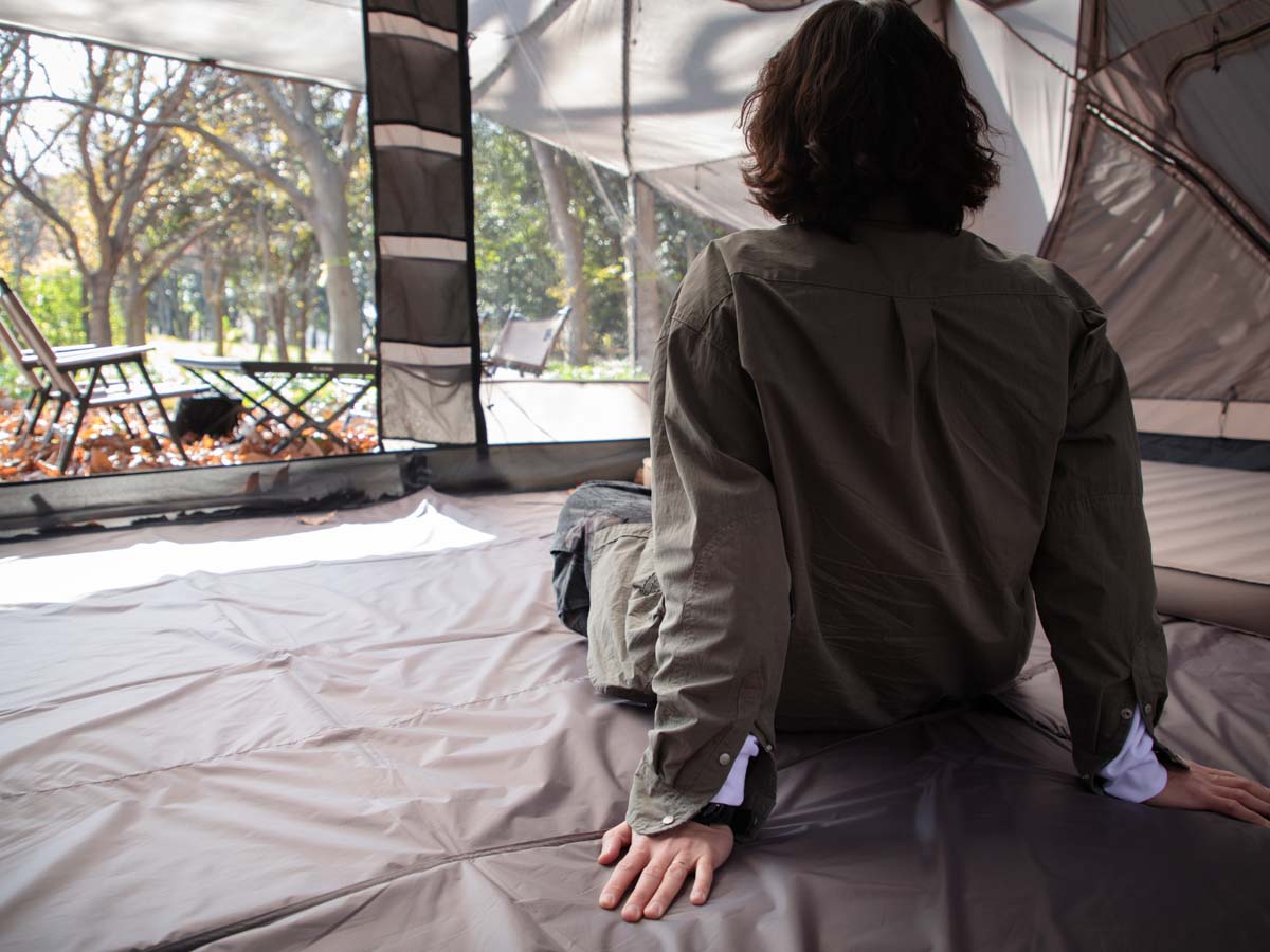 寝室スペースや、お座敷スタイルのマットとして幅広い季節やシーンでご使用いただけます。お座敷スタイルではギアバッグやクーラーバッグを床に直接置いても汚れや濡れる心配がないので、持っていく荷物がシンプルにまとめやすくなります。