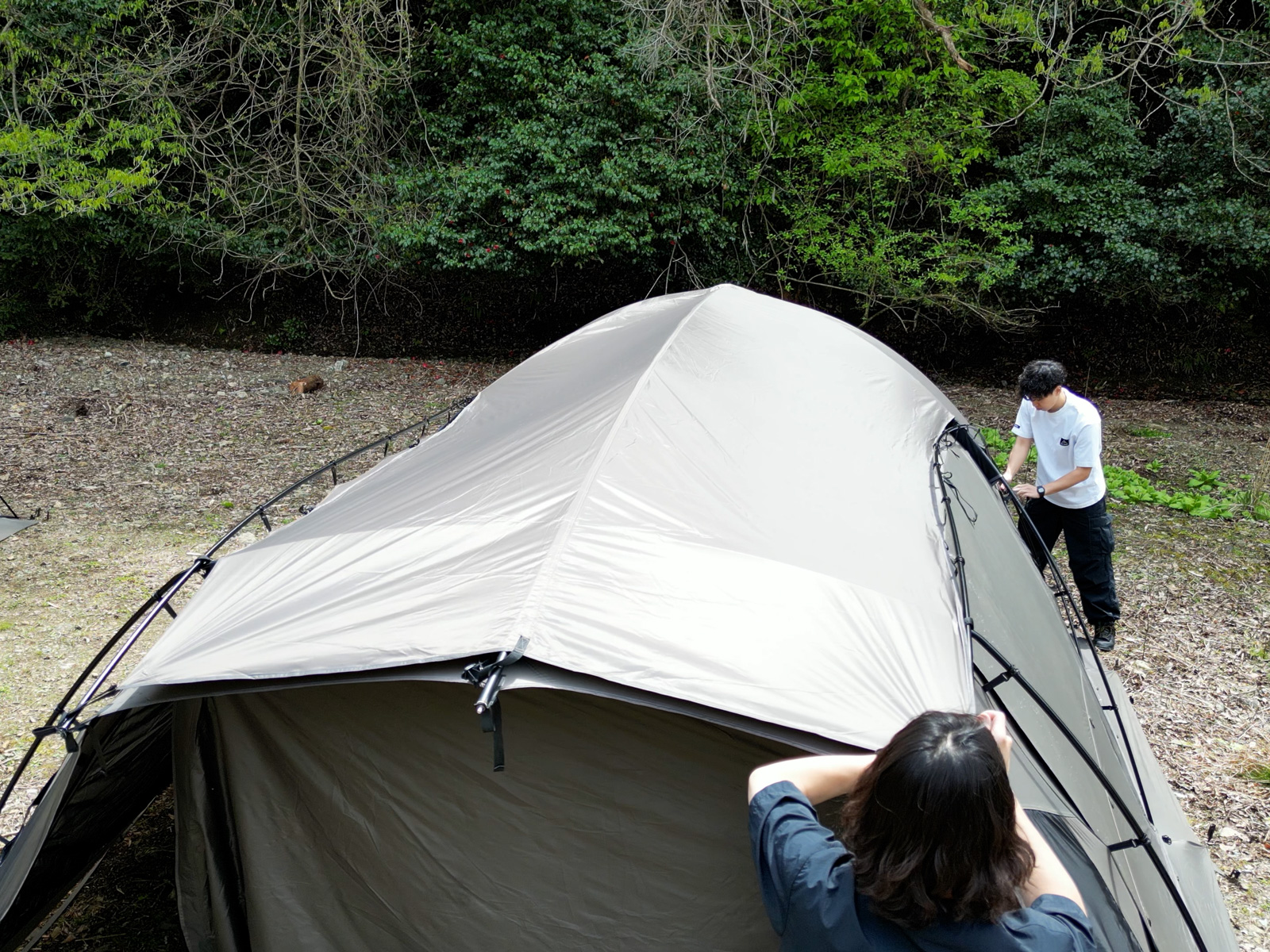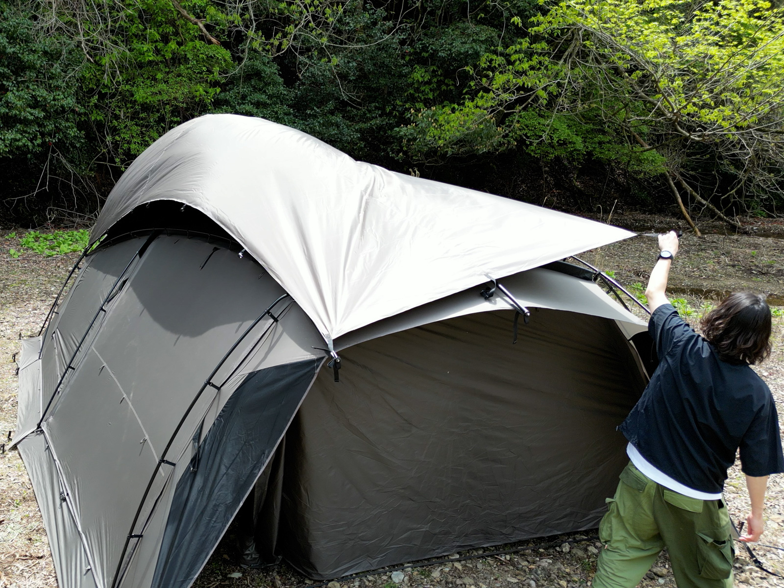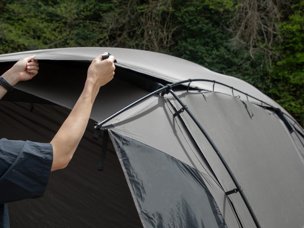 BODEN G2 MIDのフライシート(ルーフトップ部分)は遮光性の高いPU加工を施しており、既に遮光性は高いのですが、真夏などより強い日差しの下でも安心してご使用いただけるように遮光性を向上します。また、フライシートとルーフプロテクタの間に空間を作る(空気の層)を作ることで結露の発生を低減します。些細な部分ではありますが、多少の雨音の軽減にも効果を発揮します。