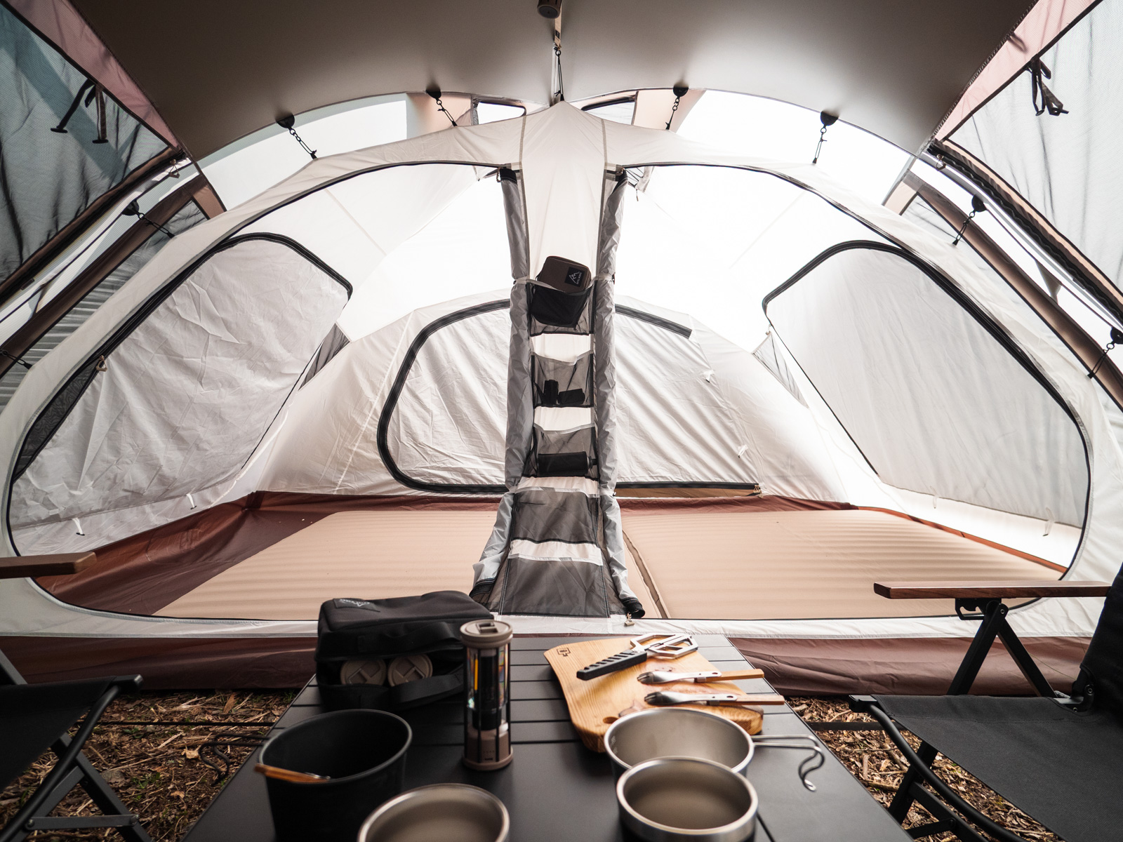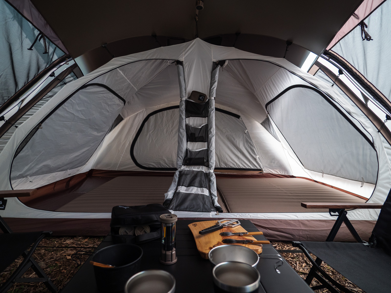 | 材質 | [NL]40Dナイロン(シリコンコーティング/遮光PUコーティング※リビングのみ/UVカット加工/撥水加工※耐水圧3,000mm) [BF]150DポリエステルBF(PUコーティング/遮光PUコーティング※全面/UVカット加工/撥水加工※耐水圧5,000mm) |