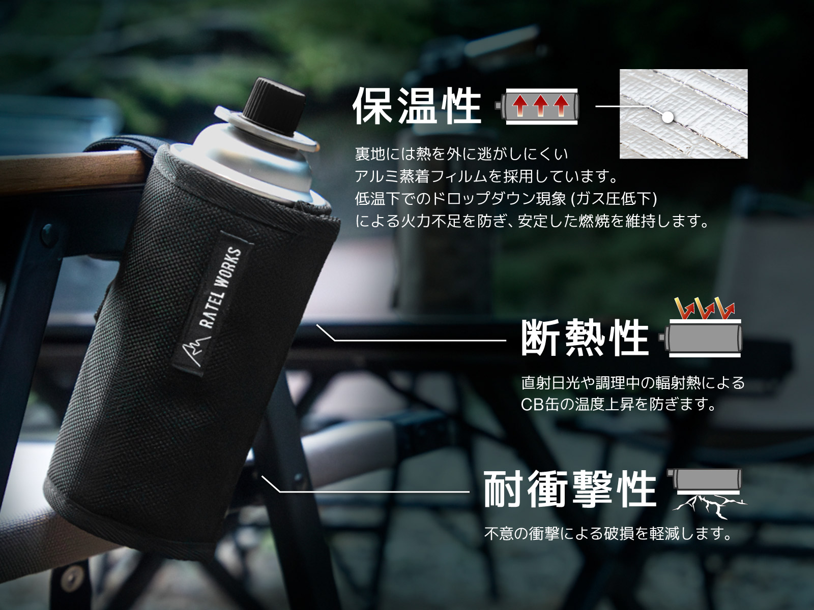 熱を外に逃がしにくいアルミ蒸着フィルムを裏地に使用。これにより断熱性が高まり、冬場や標高の高いキャンプ地でもガス缶の温度低下を抑えることができます。特に、低温下でのガス圧低下(ドロップダウン現象)による火力不足を防ぎ、安定した燃焼を維持。朝の冷え込みでもお湯が早く湧き、ホッと一息つける 暖かい飲み物を楽しむことができます。