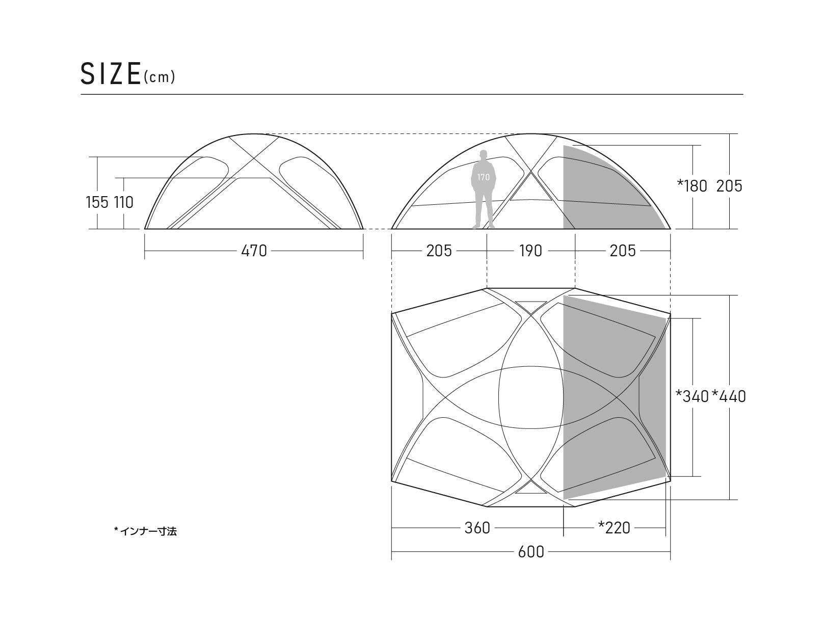 サイズ | フライシート設営時:約W470 ×D600 ×H205cm 収納サイズ:約W70 ×D45 ×H30cm |