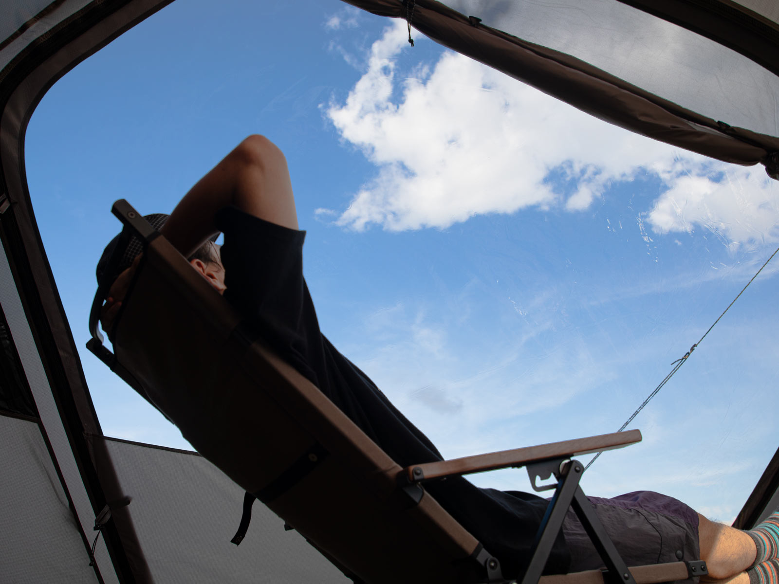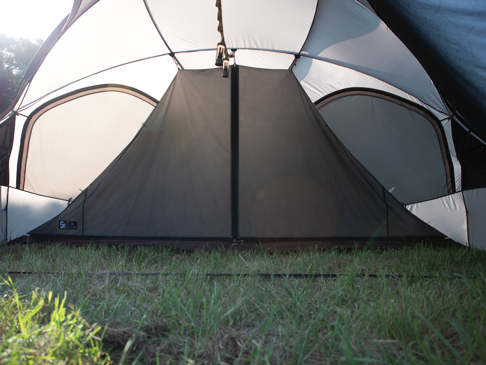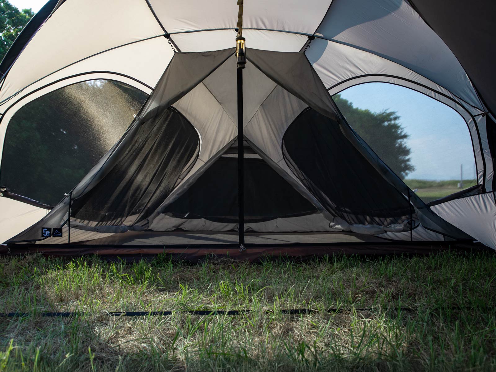 特徴的な中央両開き式のインナーテントは、メッシュ状態にするとまるで蚊帳のように視界を遮らず、前室との一体感を生み出します。家族がそれぞれの時間を過ごしながらも、互いを見守れる安心感があります。風通しも良く、通気性は抜群で結露防止効果があります。蒸し暑い季節でも快適に過ごすことができます。