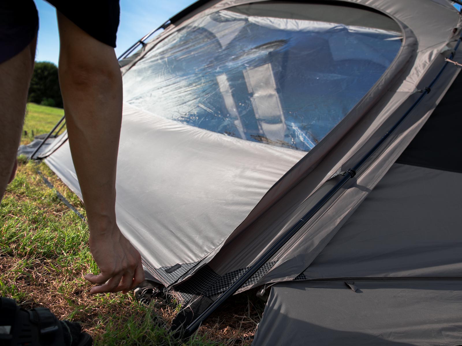 FELSEN(フェルセン)は窓や通気口が全て外メッシュ構造のため、テント内にいながらメッシュ状態へ巻き上げることができます。TPUフライパネルも同様に、テント内から巻き上げ可能です。寒い冬でも手間をかけず簡単に空気の流れを確保し、結露を軽減します。