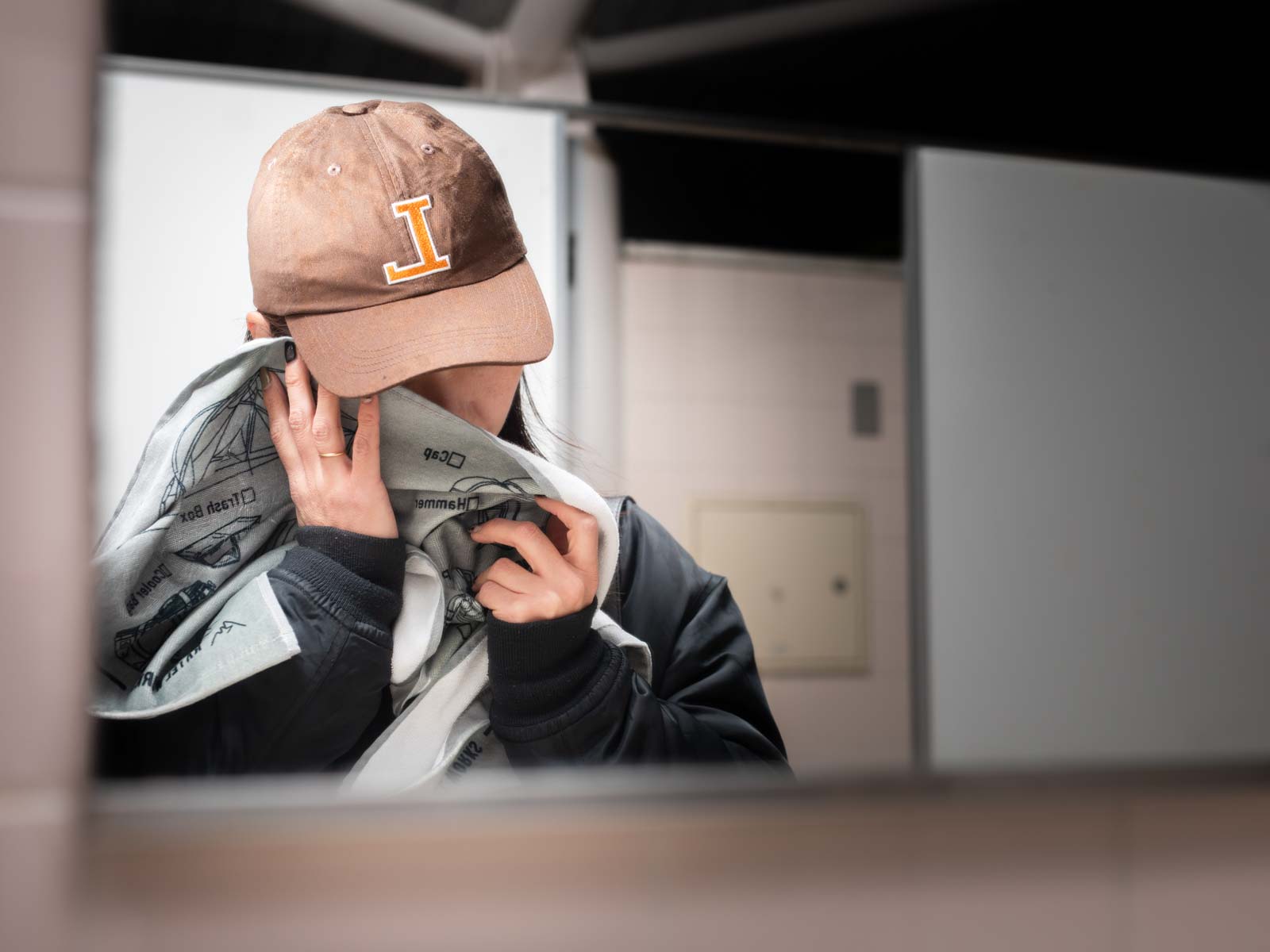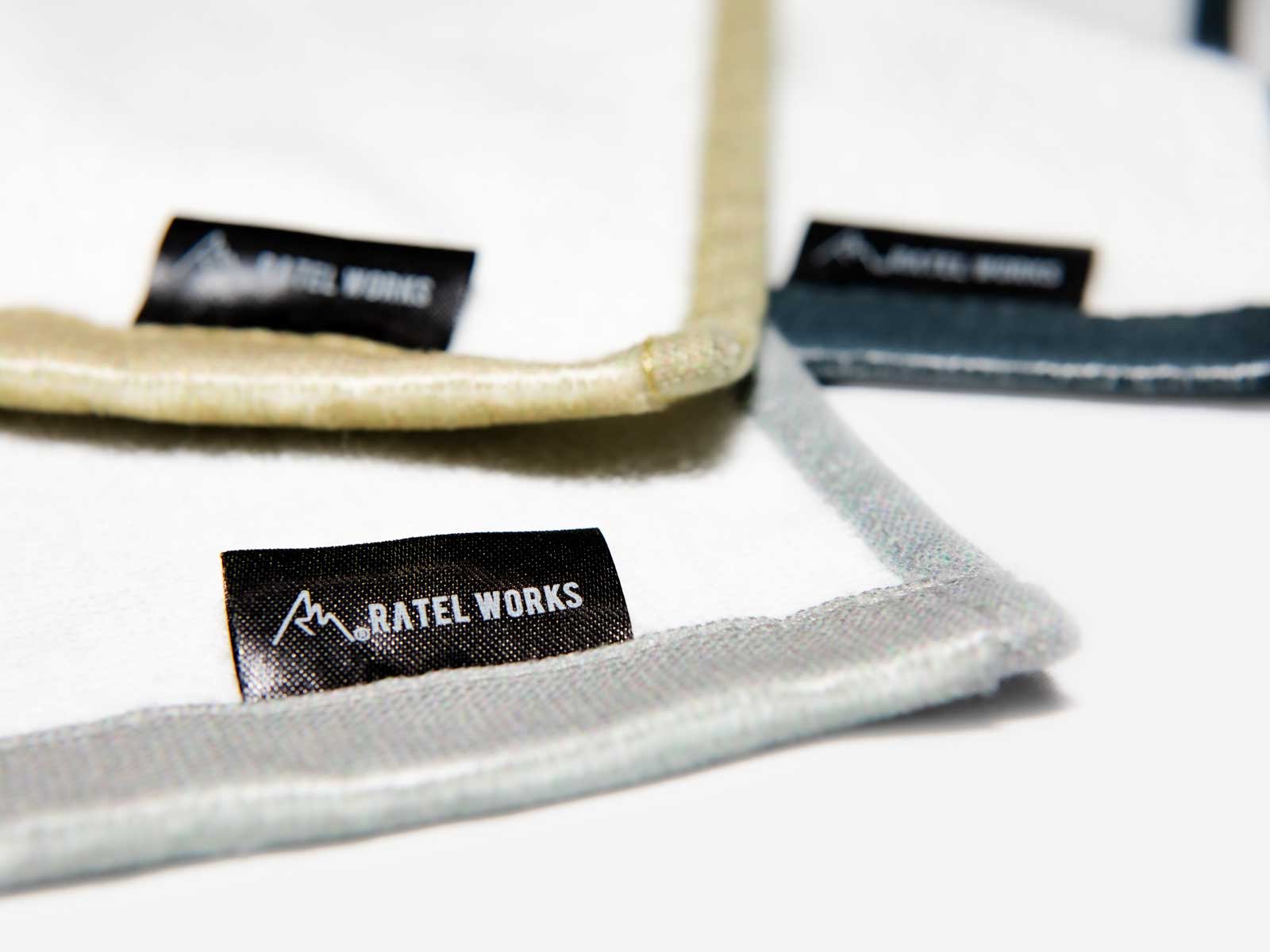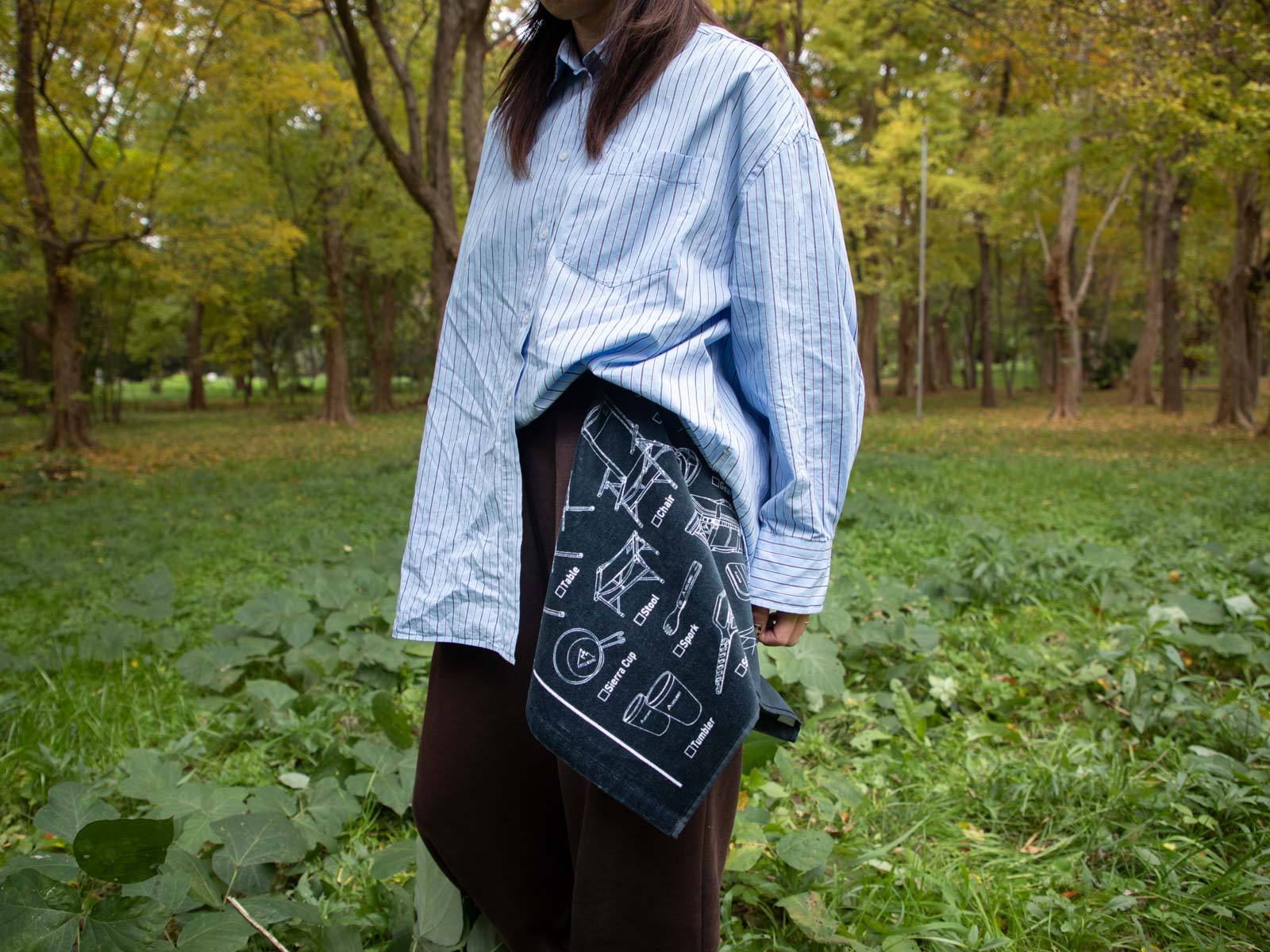 掛けて使うシーンを想定し、ロゴは正位置で美しく見えるよう配置しています。日常の中でさりげない存在感を演出します。