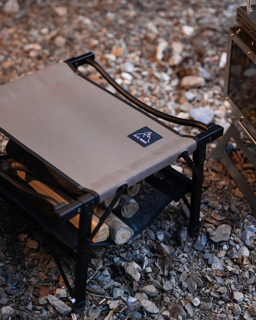 多機能スツール (焚火スツール/オットマン/ストレージスタンド) として活躍する一脚。
